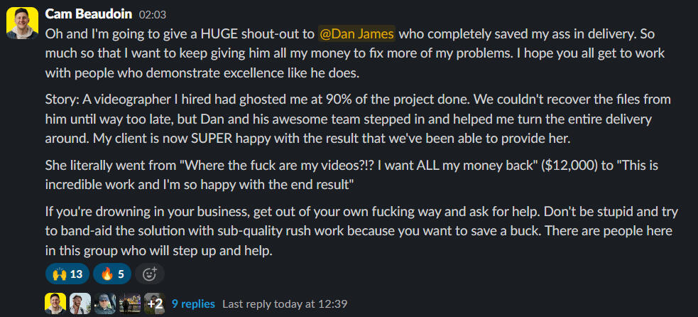 The final product was so good that my client went from: “Where the fuck are my videos?! I want ALL my money back” to “This is incredible work. I’m so happy with the end result.” If you’re drowning in your business, stop trying to duct-tape your way out of it. Get help.